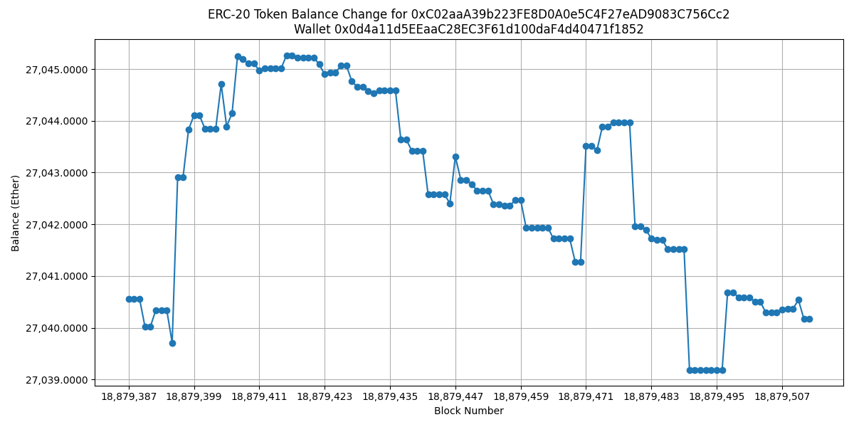 matplotlib. The x-axis represents block numbers, and the y-axis represents the balance in Ether. - The axis tick labels are formatted for better readability, and the chart is titled with the contract and wallet address for reference.